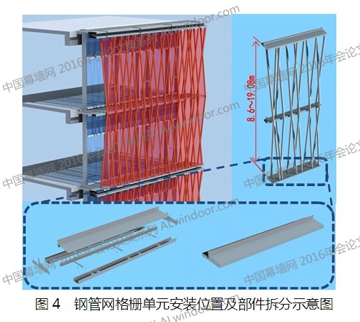 格柵標(biāo)準(zhǔn)單元高度跨2層建筑結(jié)構(gòu),高度為8600mm,水平分格為2100mm。鋼管前后斜拉分布,側(cè)面看斜拉的鋼管格柵之間形成菱形,中間分格位置用鋁 方管支撐。