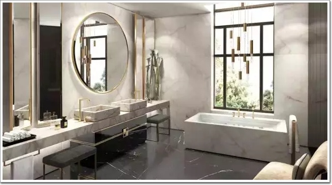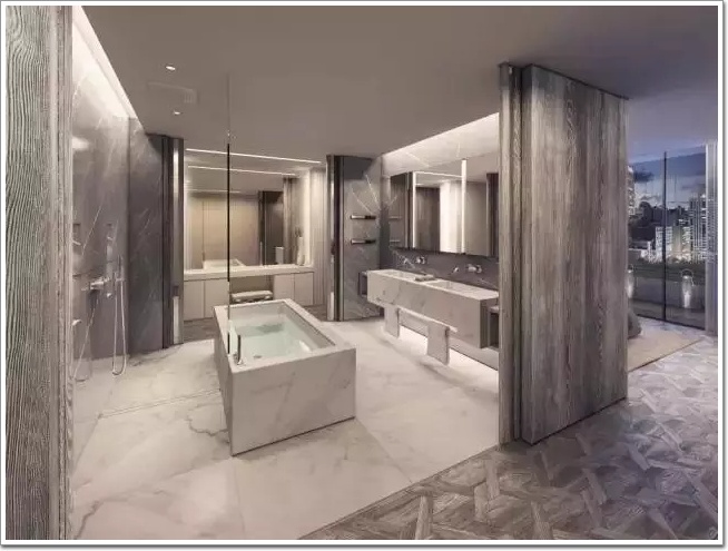 大開間的衛生間,浴缸在正中間,可見空間的使用是多么奢侈。
