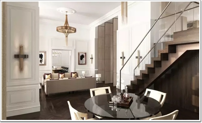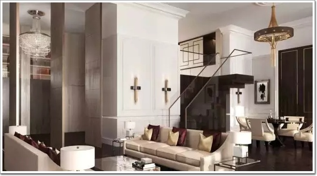 原來歐式也可以設計成灰色調,因為空間高,歐式護板故意不到頂,混合現代風格的壁燈和樓梯,完全打破了我們常規的設計想象。