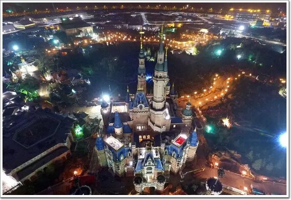 2016年4月8日,夜晚航拍的上海迪士尼奇幻童話城堡。