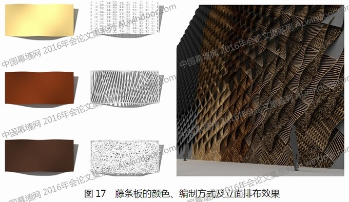 西班牙館外墻采用了三種不用顏色和編制方式的藤條板分別組合,翹曲(詞條“翹曲”由行業大百科提供)的板型組成波浪起伏的立面,如同舞者飛揚的裙邊(圖17)。 深淺各異的藤板是在山東賓州純手工編制制作完成的,不經過任何染色,藤條用開水煮5小時可變成棕色,煮9小時接近黑色,這就是這些藤板色彩不一的秘訣。: