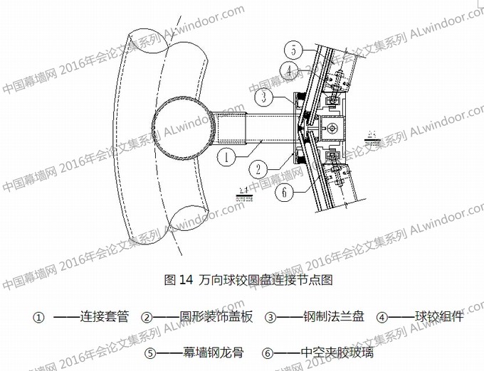3、鋼制法蘭盤與主體鋼結構連接套管采用兩段不同直徑的鋼管套接,可以實現垂直于幕墻面進出向的調節,保證了施工安裝的精度,使得幕墻曲面擬合更為順滑。