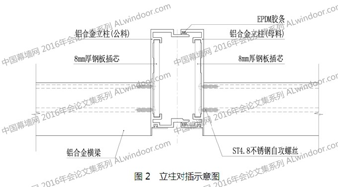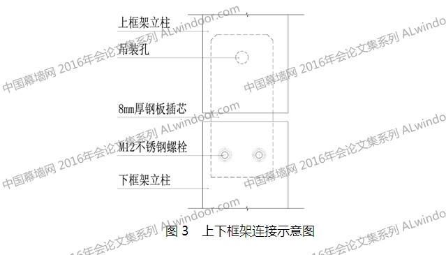 預制構件式幕墻由面板和預制框架組成。預制框架由立柱和橫梁組成,在工廠采用自攻螺絲連接組裝(見圖1)。立柱設計成槽型截面(詞條“截面”由行業大百科提供),左右框架之間通過立柱的對插,形成封閉截面的立柱,立柱接觸處采用膠條隔開以避免摩擦噪音(見圖2)。上下框架對接位置避開橫梁,采用插芯上下插接(見圖3)。如果橫梁距離立柱對接位置較大,也可以把上下框架之間的橫梁設計成槽型,分別與上下框架組成框架,上下框架對插后連接處橫梁形成封閉截面的橫梁(見圖4)。框架與主體結構的連接與構件式幕墻相同,即框架左右立柱分別采用鋼角碼與埋件連接,可以實現三維調節(見圖5)。上下框架之間通過插芯連接,插芯同時也是施工時的吊裝件。橫梁、立柱在工廠制成一個樓層高度的支承框架,框架運輸到