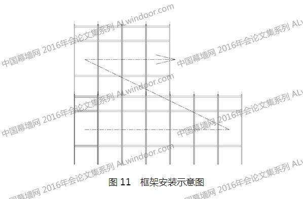 預制構件式幕墻先安裝框架,再安裝面板。框架的安裝類似于單元式幕墻安裝,由低層向高層分層安裝。同一樓層內可以按順時針或逆時針方向安裝,面板板塊比框架推遲2~3層安裝,并隨框架同步距向上安裝(見圖11)。