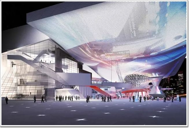 釜山電影中心,位于釜山市一處沿海的新開發的區域,這里沿襲著典型亞洲式的大規模開發模式。2005年,由藍天組的創始人Coop Himmelb(l)au主持設計的方案在競標中獲勝,他的設計采用巨大的懸挑,形成有遮蔽的公共空間。這一理念使方案得到業主的賞識,成功中標,于2011年建成使用。