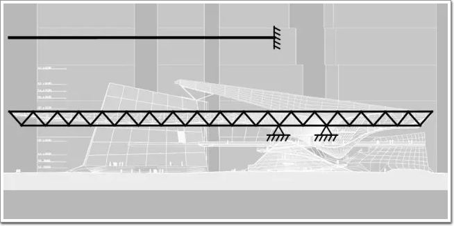 在競標之初,方案就已經確定以巨大的桁架結構實現懸挑,同時已經確定桁架結構需要由兩個支點,而非通常的一個支點來進行支撐,支撐點位置的桁架高度相應更大一些。
