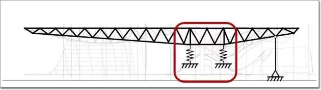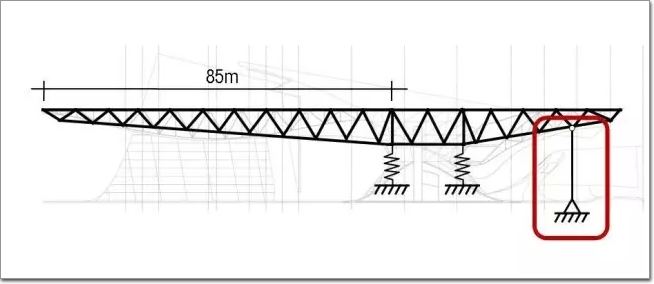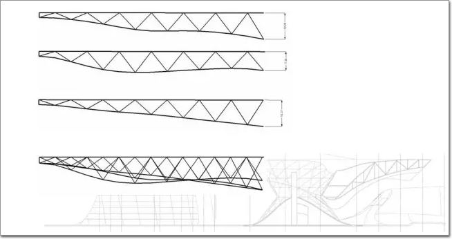 在桁架結構中,上面的桿件受拉,下面的桿件受壓。這個懸挑結構從盡端到支撐點的距離有85m,同時也并非一種簡單的直線形態——懸臂的下表面崎嶇不平,這也對整個桁架的不同截面提出了不同的形態要求。