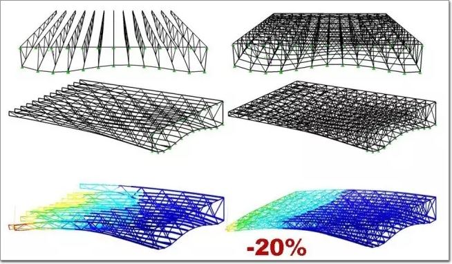 為了減少形變,我們在另一個盡端增加了一個受拉的桿件,使整個屋頂的形變減少了15%。