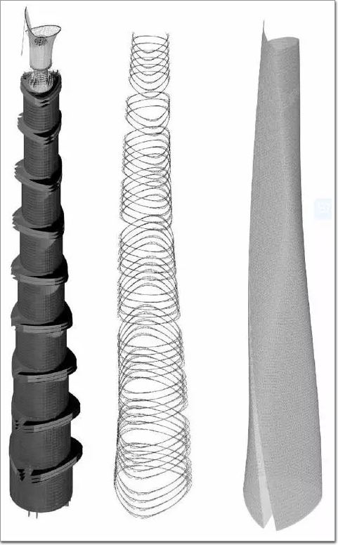 外層幕墻逐層收窄,賦予了大樓優(yōu)雅的錐度造型。而幕墻上的一條V 型溝槽則是用來突出大樓的螺旋造型。