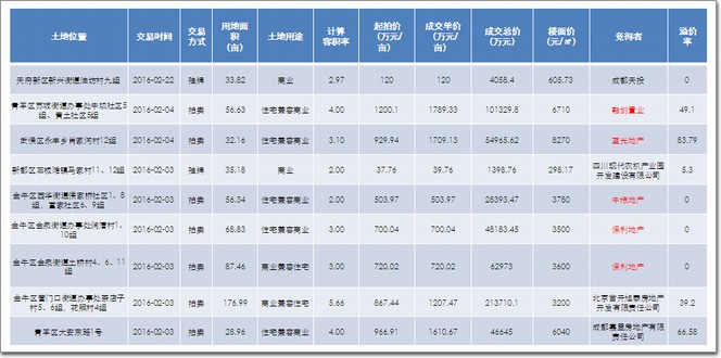 8、1月共成交14宗地,2016年土地市場平穩開場:本月最高溢價97.5%意外地來自崇州;藍光26.44%溢價強勢拿下犀浦47畝地塊;優品道16.19%溢價再次出手新都;蔚藍卡地亞、中航、德商先后拿下天府新區地塊。