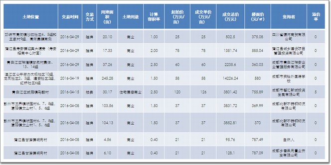 11、4月僅青白江成交1宗住宅兼容商業地塊,其它均為純商業用地,底價成交。