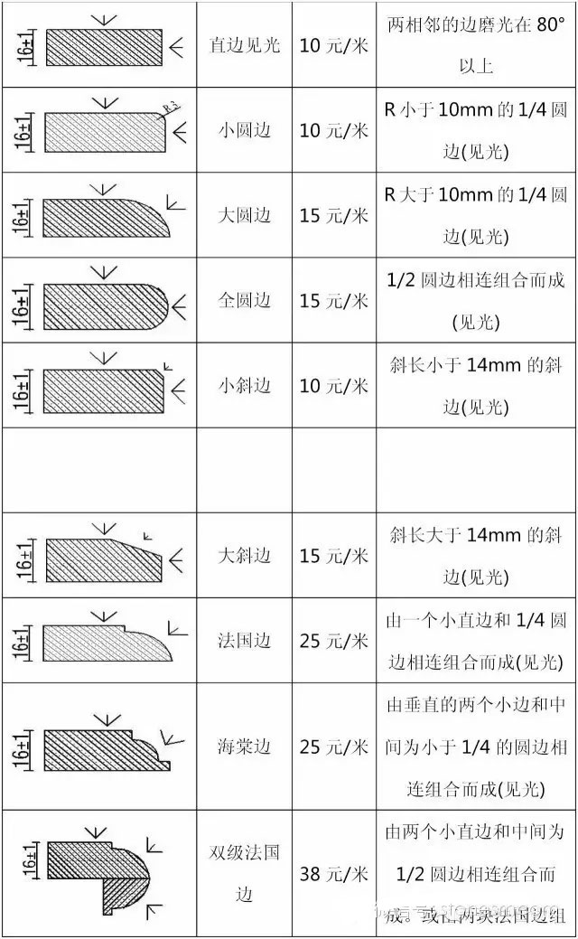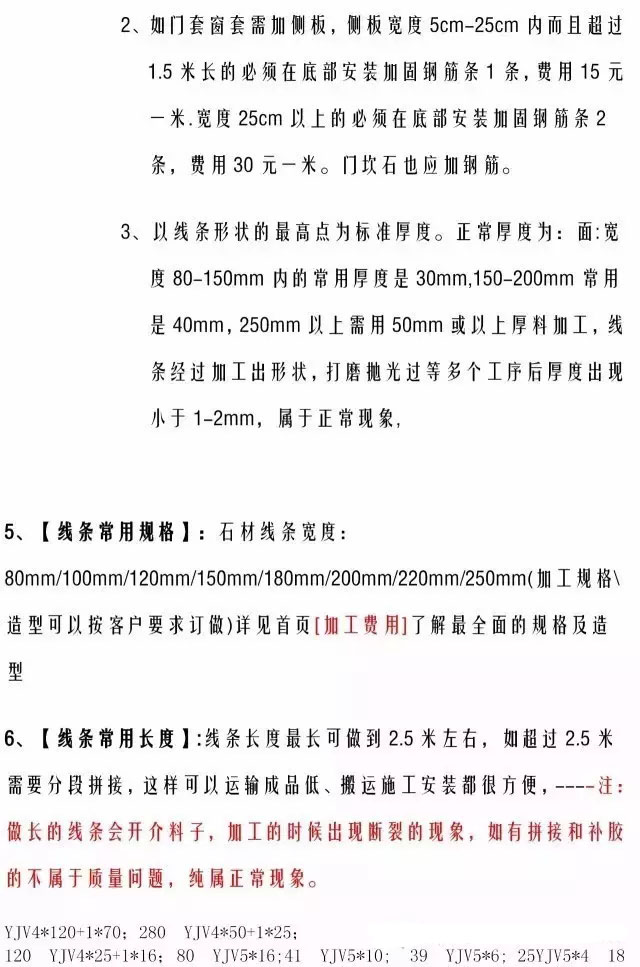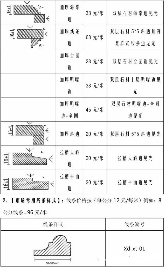 石材成品價格包括原材料以及加工費等,原材料不同的品種價格差別較大,加工費用也因實際地區各異、石材加工難度不同,存在差異。所以這份加工費價格表,僅供行業人士參考!