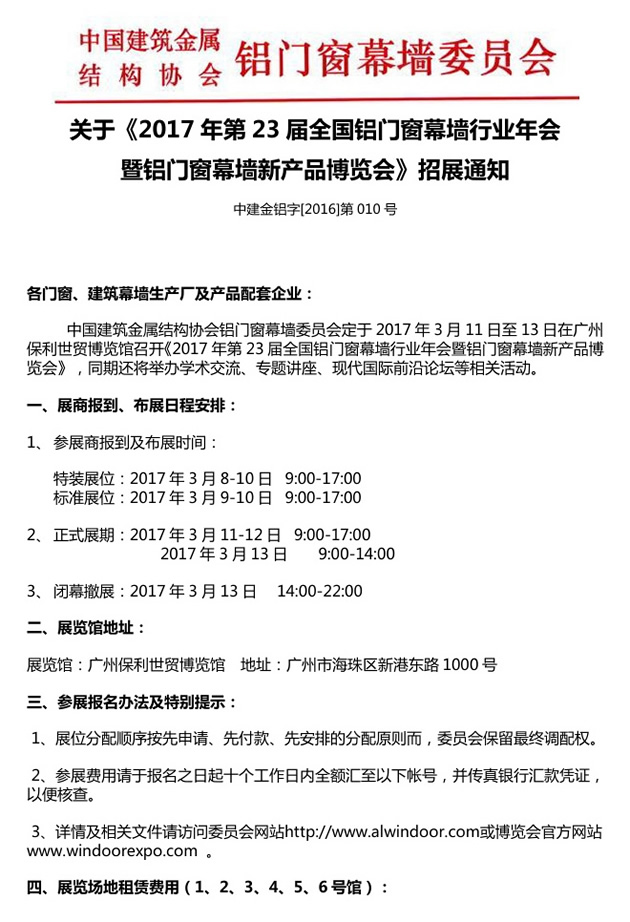 關于《2017年第23屆全國鋁門窗幕墻行業年會暨鋁門窗幕墻新產品博覽會》招展通知