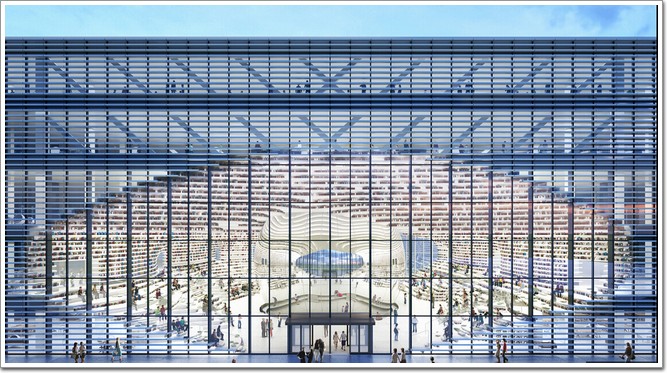從目前公布的效果圖來看,天津濱海圖書館將被放置在一個“玻璃盒子”里,圖書館由一個橢圓形的開口直穿建筑中部,由“眼”撐開;“眼”是一個球形鏡面報告廳,它矗立于中央天井內,內部呈“掏空”狀態,極大程度的擴大空間的視覺效果。路過的行人可以通過橢圓形開口直觀室內360度全景,內里鋪天蓋地的藏書一覽無余,而玻璃幕墻則反射出樓前公園的美景。此外,圖書館內部構造又讓人聯想到“太空飛船",階田式的書架貫穿中央天井,與球體相呼應,形成一個內部地形景觀,它的輪廓向外延伸,將使用者一路帶入圖書館中心,然后圍繞建筑形成外墻的柵格式玻璃幕墻,而柵格式的設計可以很好的起到遮陽效果,有效節能保溫,這樣的整體組合為圖書館增添了互動性、趣味感和科幻視覺效果。