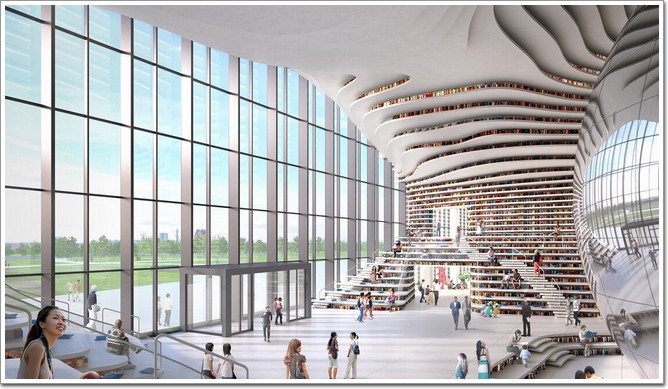 天津濱海圖書館,通過橢圓形開口可直觀室內萬千藏書