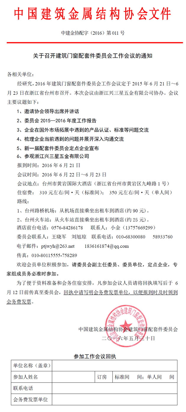 經研究,2016年建筑門窗配套件委員會工作會議定于2015年6月21日~6月23日在浙江省臺州市召開。本次會議由浙江興三星五金有限公司協辦。會議主要議題如下:
