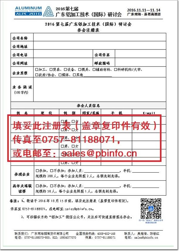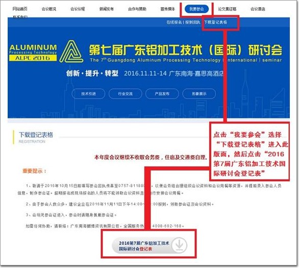 2016年第七屆廣東鋁加工技術(國際)研討會(以下簡稱“鋁加工研討會”)正有條不絮籌備中,其中免費參會報名活動已在7月15號正式啟動。為了方便廣大不同參會者進行預報名,組委會為參會者提供手機、網站、傳真三大報名方式,您掌握了嗎?下面讓小編為大家詳細介紹三大報名方式的具體操作步驟吧: