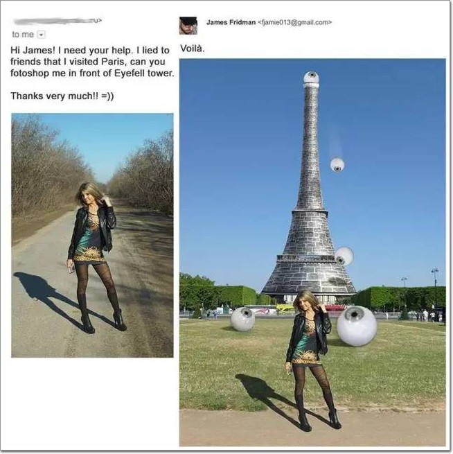 求助:我跟朋友撒謊說去了巴黎,你能把我P到艾菲爾鐵塔前面嗎(把艾菲爾“Eiffel”的英文錯寫成了“Eyefell”,意思成了“眼球掉落”)
