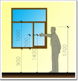 需要解釋一下的是高度:我們在關注窗戶太大的問題的時候,常常只關注寬度,其實高度也很“致命”。對于一般的外平開窗來說,在窗臺高度一定的情況下,窗扇越高,開啟把手的位置也會越高,而在“伸臂→俯身”這個開窗動作過程中,人手所能達到的高度是呈現下降趨勢的。所以,窗扇太高、把手太高,會加大操作的不便。身高1.6~1.7m的普通人,手臂平伸的高度約為1.4~1.5m,按照普通窗臺0.9m高考慮,1.0~1.2m是開啟扇的合理高度(見下圖)。