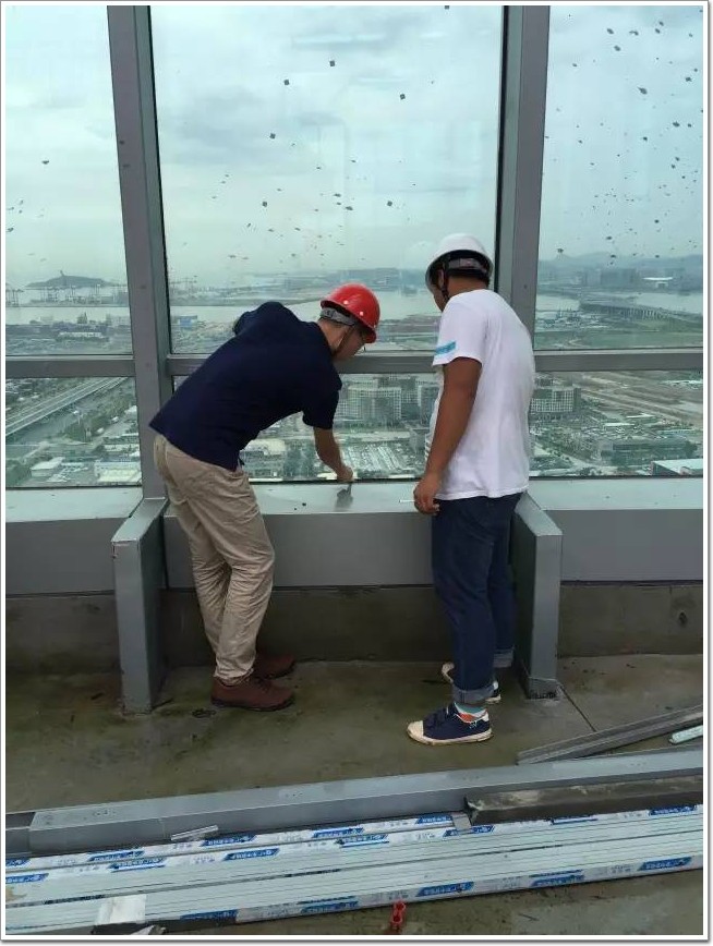 安泰建筑膠技術(shù)服務(wù)人員在深圳財富大廈檢驗玻璃幕窗的牢固性