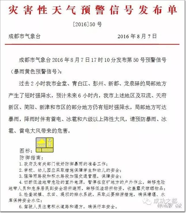 當地(成都市)氣象臺發布的暴雨黃色預警信號