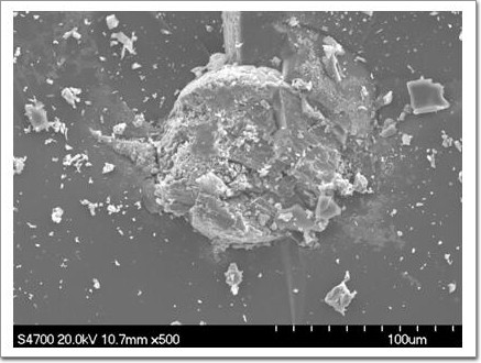 玻璃碎片樣品的電鏡照片,可見硫化鎳粒子,該雜質可引發玻璃自爆