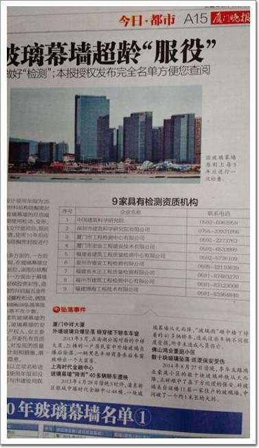 近年來廈門對服役十年以上玻璃幕墻進行可靠性鑒定,中國建筑科學研究院國家建筑工程質量監督檢驗中心為廈門市建設局最早推薦的檢測機構。