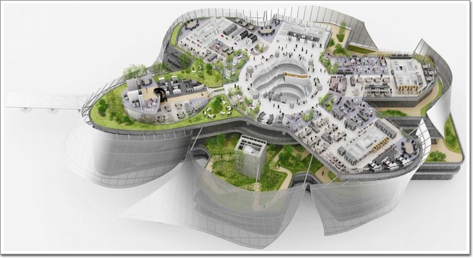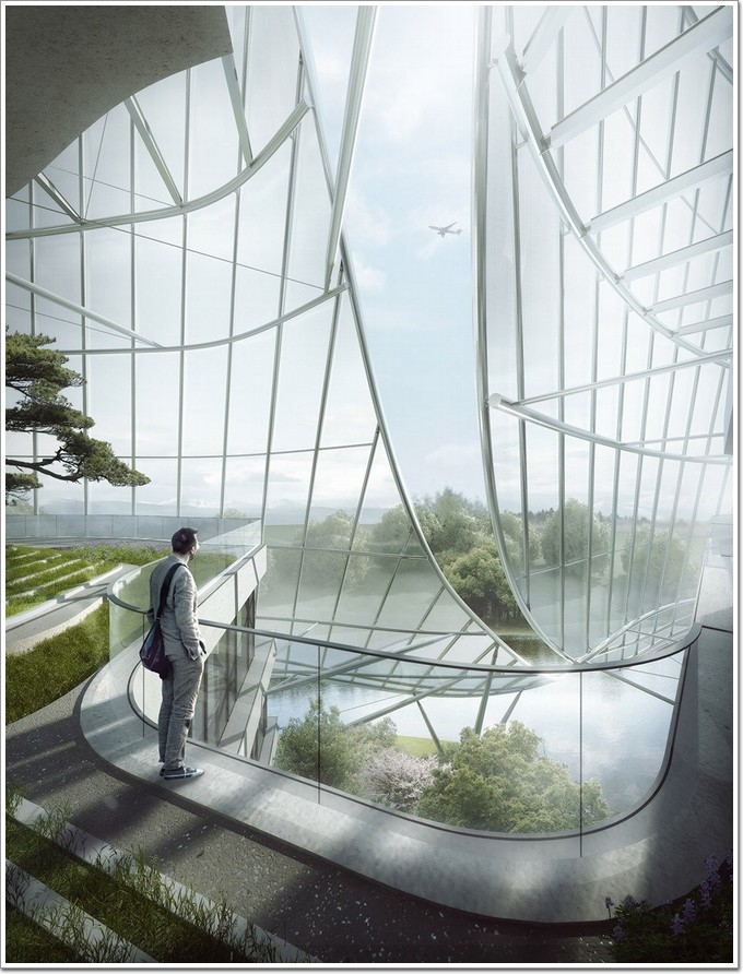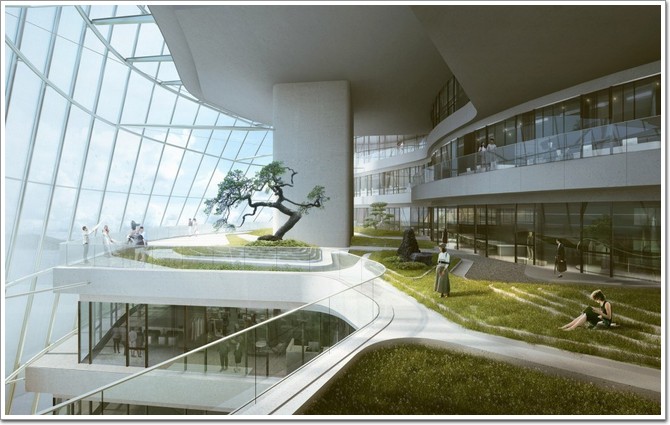 作為一個創(chuàng)新型的辦公建筑,其空間組織結(jié)構(gòu)如同圍繞中心點展開的六個花瓣,使得集團六大品牌既有自己獨立的辦公研發(fā)空間,又可以與其它部門相互交流。有別于常見的方盒子建筑,發(fā)散型布局使得辦公空間靈活高效,并具有足夠的自然光線,通風(fēng)和景觀。作為公共區(qū)域有中庭,向不同品牌的員工、客人開放,其間的天橋除作為空中的交通連接外,還可以用作時裝秀等表演空間。設(shè)立于中庭的兩個景觀電梯又將半透的辦公中廳空間在豎向上連接在一起。內(nèi)部與外部環(huán)境連接,將研發(fā)中心的公共交流從室內(nèi)延伸到室外花園,為員工提供輕松的氛圍和場所,同時具有很強的向心力。
