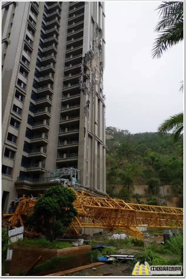 圖6:因大風導致“云頂至尊”施工現(xiàn)場的塔吊倒塌,塔壁砸壞東南面的幕墻石材,并非之前網(wǎng)上謠傳的臺風“吹”得石材脫落