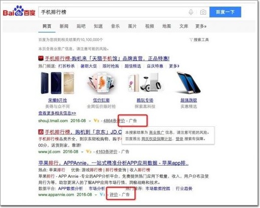 作為受影響最大的百度搜索,TechWeb查詢發(fā)現(xiàn),目前百度的搜索結(jié)果頁面的廣告樣式已經(jīng)由原來的 “商業(yè)推廣 ”變成 “廣告 ”二字描述了。