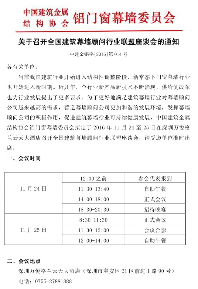 當前我國建筑行業開始進入結構性調整階段,新常態下門窗幕墻行業也開始進入新時期。近幾年,全行業新產品新技術不斷涌現,供給側改革也為行業發展提出了更多要求。為了更好地滿足建筑幕墻(詞條“建筑幕墻”由行業大百科提供)行業對幕墻顧問公司越來越高的需求,營造幕墻顧問公司更加和諧的發展環境,發揮幕墻顧問公司的積極作用,促進建筑幕墻行業可持續健康發展,中國建筑金屬結構協會鋁門(詞條“門”由行業大百科提供)窗幕墻委員會擬定于2016年11月24至25日在深圳萬悅格蘭云天大酒店召開全國建筑幕墻顧問行業聯盟座談會,請受邀單位準時出席。