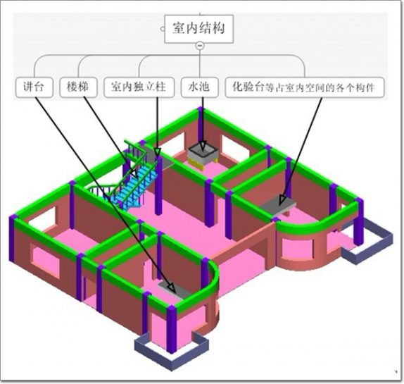 首層室內(nèi)結(jié)構(gòu)包含的構(gòu)件可能有:講臺、樓梯、室內(nèi)獨(dú)立柱、水池、化驗(yàn)臺等占室內(nèi)空間的構(gòu)件,見圖3.3: