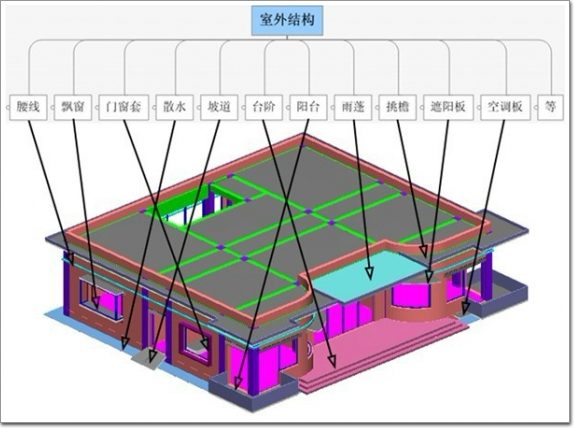 首層室外結(jié)構(gòu)包含的構(gòu)件可能有:建筑物腰線、飄窗、門窗套、散水、坡道、臺階、陽臺、雨蓬、挑檐、遮陽板(詞條“遮陽板”由行業(yè)大百科提供)、空調(diào)板等外墻皮以外的構(gòu)件,見圖3.7: