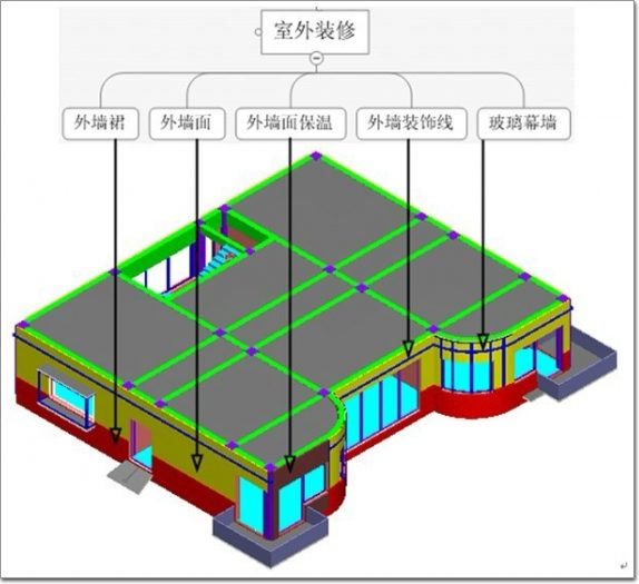 首層室外裝修包含的構(gòu)件可能有:外墻裙、外墻面、外墻面保溫、外墻裝飾線、玻璃幕墻等,見圖3.15: