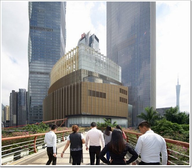 外部的四個(gè)流線形退臺設(shè)計(jì),象征建筑內(nèi)部不同的功能,階梯式收進(jìn)的水平線亦與周圍建筑的不同高度相呼應(yīng)。退臺頂部設(shè)置為花園戶外平臺,在平臺上可縱覽廣州城市風(fēng)景。東塔的地下購物廊道直接連向地鐵站,將項(xiàng)目整合進(jìn)城市、甚而整個(gè)珠三角區(qū)域。