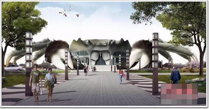 有些大閘蟹是用來吃的,但在昆山陽澄湖岸邊赫然聳立的一幢大閘蟹建筑物可就不是用來吃的了,這是建造中的“大閘蟹生態館”。它整體的外形是按照陽澄湖大閘蟹的標準來進行建造的,青綠色的貝殼,白色的腹部,黃色的爪子,惟妙惟肖,可以說是栩栩如生。