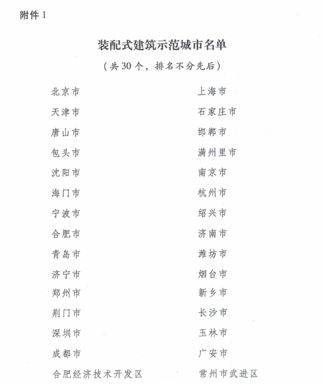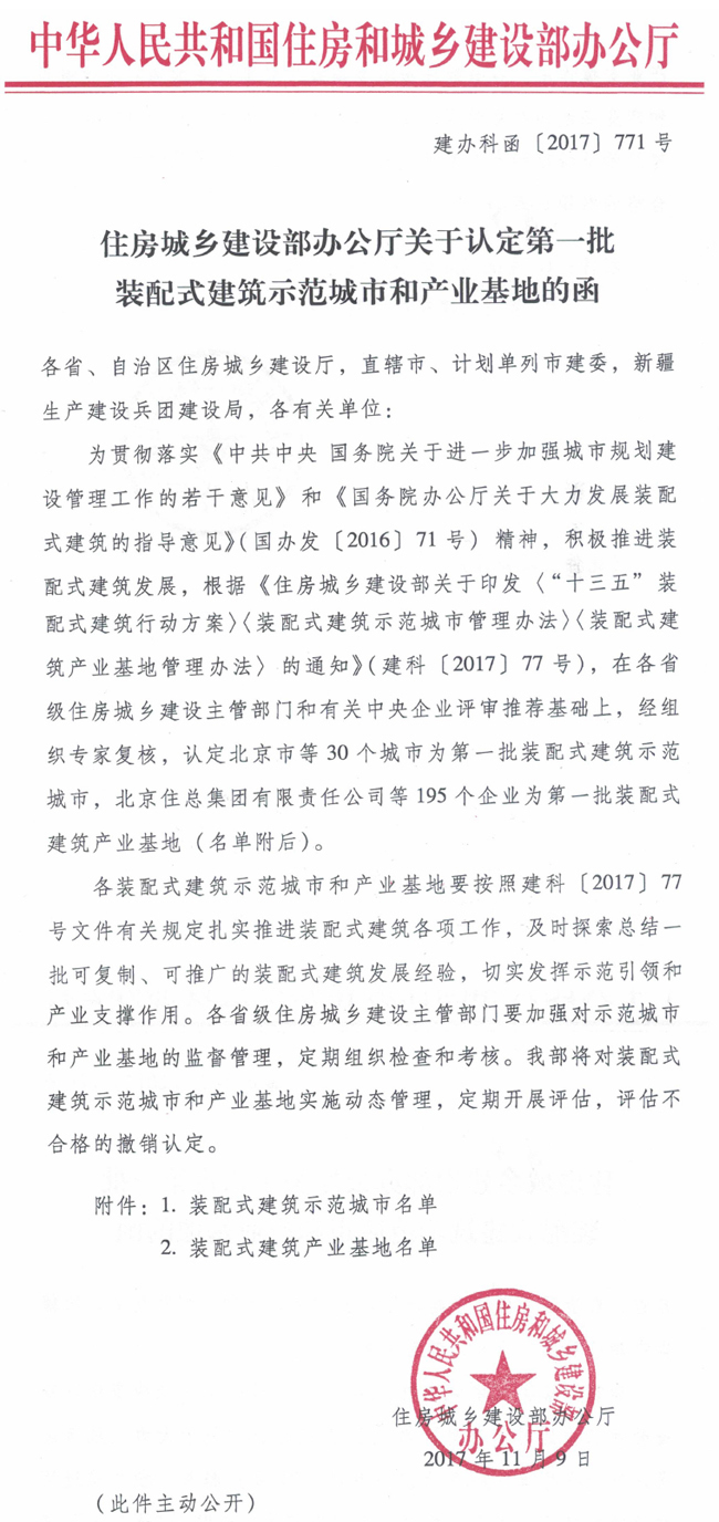 為貫徹落實《中共中央國務院關于進一步加強城市規劃建設管理工作的若干意見》和<國務院辦公廳關于大力發展裝配式建筑的指導意見》(國辦發【2016)71號)精神,積極推進裝配式建筑發展,根據(住房城鄉建設部關于印發<“十三五”裝配式建筑行動方案><裝配式建筑示范城市管理辦法>(裝配式建筑產業基地管理辦法>的通知》(建科(2017)77號),在各省級住房城鄉建設主管部門和有關中央企業評審推薦基礎上,經組織專家復核,認定北京市等30個城市為第一批裝配式建筑示范城市。同時北京、上海、廣東、福建、湖南、山東、四川、安徽、河北等地區的建筑設計院,以及遠大可建、中建科技、蘇州金螳螂、浙江亞廈、廣州白云化工、成都硅寶科技、北新建材等,共計195家企業為第一批裝配式建筑產業基地。