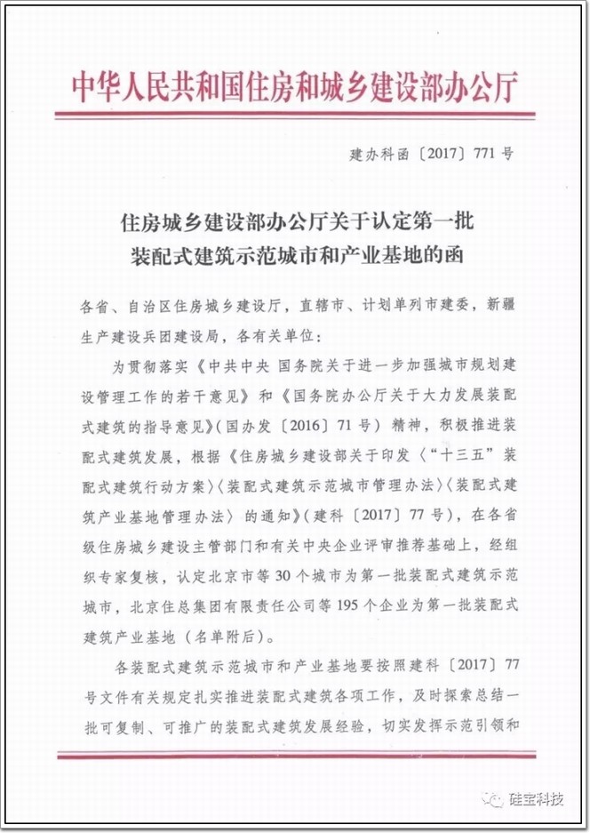 根據國家住房和城鄉建設部發布的建辦科函[2017]771號文件《住房城鄉建設部辦公廳關于認定第一批裝配式建筑示范城市和產業基地的函》,成都硅寶科技股份有限公司正式獲批國家第一批“裝配式建筑產業基地”。