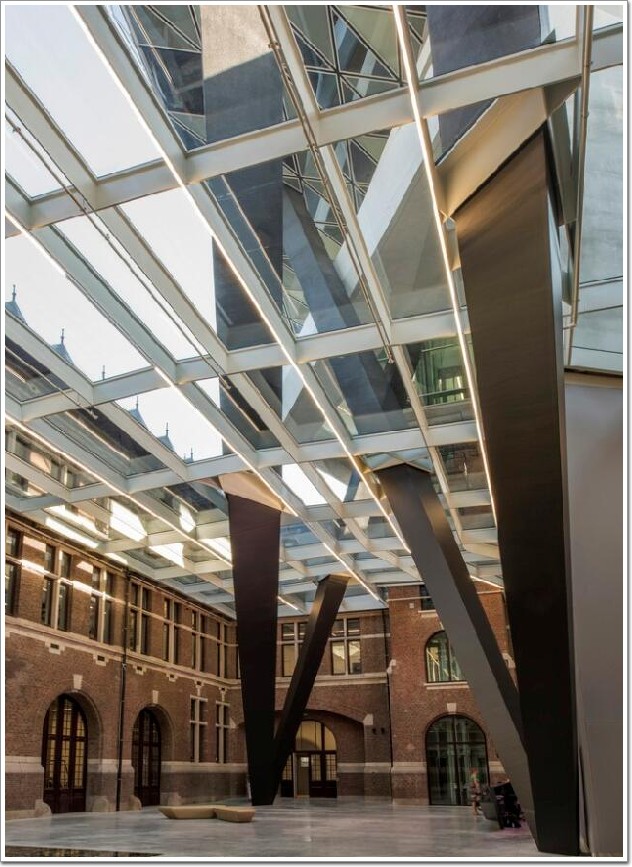 舊消防站的中央庭院上方建起一個玻璃屋頂,被改造為新港口大樓的主要接待區。游客可以從這個中庭進入歷史悠久的公共閱覽室和圖書館;這里曾是廢棄的消防站車庫,已得到精心修復和保護。通過全景觀光電梯可以直接進入新體塊內部,原建筑和新體塊間還設有室外橋梁,可欣賞城市和港口的全景。客戶“活動辦公”的需求被整合到設計中,相關區域如餐廳、會議室和禮堂,位于原建筑上層中心和新擴展區底層。距離中心更遠的其余樓層設有開放式辦公室。