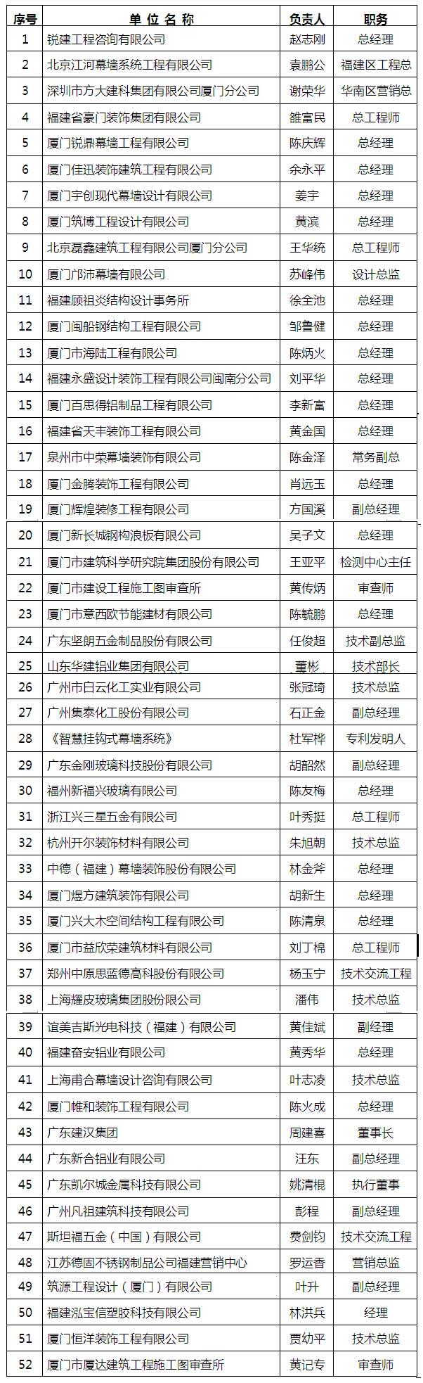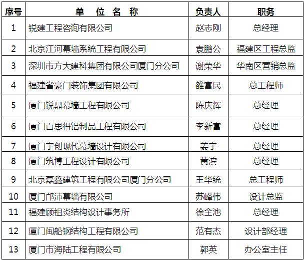 出席會(huì)議的領(lǐng)導(dǎo)、嘉賓包括:廈門市建設(shè)局巡視員、副局長、教授級高級工程師林樹枝博士,廈門市勘察設(shè)計(jì)協(xié)會(huì)理事長、廈門合立道工程設(shè)計(jì)集團(tuán)股份有限公司張惠蓮董事長,廈門市勘察設(shè)計(jì)協(xié)會(huì)秘書長、廈門市建設(shè)工程施工圖審查所李紅所長,中國建筑金屬結(jié)構(gòu)協(xié)會(huì)黃圻副秘書長、中國建筑金屬結(jié)構(gòu)協(xié)會(huì)教授級高工鄭金峰先生,中國鋼結(jié)構(gòu)協(xié)會(huì)鄒魯健副會(huì)長、中國建筑科學(xué)研究院趙西安教授、福建省建筑業(yè)協(xié)會(huì)金屬結(jié)構(gòu)與建材分會(huì)李光旭秘書長、深圳市建筑門窗幕墻學(xué)會(huì)專家委員會(huì)姜成愛主任;原廈門市建設(shè)機(jī)械金屬結(jié)構(gòu)協(xié)會(huì)前任秘書長甘南山先生、廈門市勘察設(shè)計(jì)協(xié)會(huì)鋼結(jié)構(gòu)與幕墻分會(huì)新任會(huì)長、銳建工程咨詢有限公司總經(jīng)理趙志剛先生和分會(huì)專家組成員:黃傳炳、王亞平、胡小龍、劉濤、黃紀(jì)專、嚴(yán)穎斌、鐘全議、雒富民、林華民、賈幼平、陳德平、湯德英、徐全池、陳火成等以及廣大門窗幕墻工程企業(yè)代表、設(shè)計(jì)院、審圖所、幕墻咨詢顧問公司、材料廠商和房地產(chǎn)企業(yè)等代表出席。