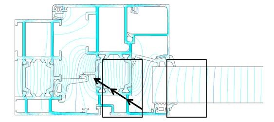 上圖中,Q是通過整個模擬節點的熱量,此例是10.17 W/m。計算原理是統計流過室內外邊界的熱量總和,亦即下圖每條連通室內外的熱量流動線的總和(每條代表0.1W/m)。同時可以看到絕緣板上兩個方框內的線密度是不一樣的:左邊方框內曲線彎曲而且較為稀疏,有部分熱量從絕緣板流入框內(箭頭的方向)。這就是耦合效應。如下圖3。