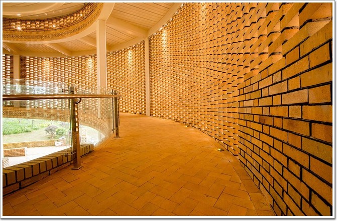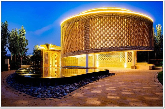 琴弦園路所引向的終點是一座以鏤空磚為外皮的圓形展館,代表“熱瓦普”的發聲裝置——“共鳴箱”,這種“粗糙”的磚墻即有著西域的粗獷,讓人聯想到戈壁沙漠的建筑風貌,同時,建筑也帶著中原的細膩,古樸而典雅。而鏤空的外皮設計除了視覺上的美觀,也能給建筑帶來很好的通風效果。