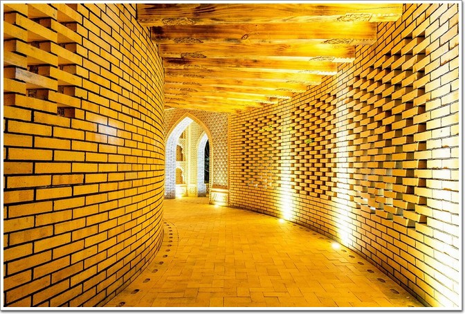 現代剛結構建筑的柱廊和暗藏的吊柱,都賦予了這座外部磚式建筑更多的懸挑和開敞可能。 建筑的屋頂及立面都采用了新疆民居“阿以旺”和涼房的鏤空磚。傳統原型和質樸材料的選擇,讓人們在感受不停變換的建筑光影同時,希望觸動他們對于美麗新疆的記憶,盡情在“麥西舞廳”內晾曬美好。