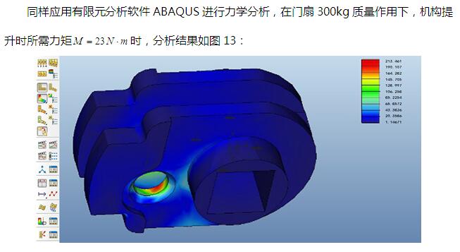 應用可同時解決線性和非線性復雜問題的工程模擬有限元分析軟件ABAQUS進行力學分析:在門扇300kg質量的重力作用下,機構提升時所需驅動力 =1483N,應力分析結果如圖12: