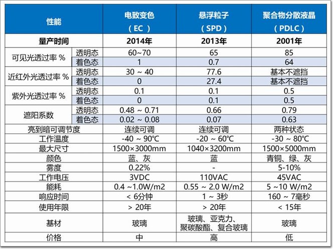對于這三種技術,我們用智能玻璃最重要的三個性能來進行比較:調光、隔熱和隱私。PDLC只有透明和散射兩種狀態,沒有中間態,而SPD和EC在透明和著色態之間連續可調。PDLC依靠微滴和基底的折射率差異將光線散射開,因此可以完全阻擋視線,具有良好的隱私保護效果,但是不能有效阻擋散射開的紅外線和可見光透過玻璃進入室內,所以其隔熱效果非常有限。國內市場上SPD的產品很少,我們通過查閱科技文獻了解其光學參數,在著色狀態下,其可見光和紅外光透過率分別是0.7%和27.4%,在透明狀態下分別為65%和77.6%。EC在著色狀態下可以阻擋絕大部分的可見和紅外光,因此在該狀態下具有極強的遮陽性能;在透明態時,60~70%的可見光以及30~40%的紅外光可以透過EC玻璃進入室內,適用于冬季采光和日曬取暖。SPD和EC技術具有良好的隔熱效果,雖然阻擋了絕大部分的可見光,但是由于人眼的高度敏感,百分之零點幾的可見光仍然不能完全阻擋視線。因此在某些場合下,比如夜晚從室外透過SPD或者EC窗往室內看,仍然可以看到室內的模糊影像,所以其隱私功能是有限的。