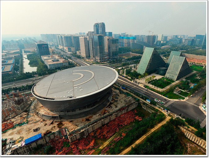 成都演藝中心項目占地面積44.28畝,總建筑面積10.4萬平方米,擁有近12000個席座。為地上6層、地下2層,總高46.6米,東西軸直徑為148米,南北軸直徑為152米,整個外形近似于一個旋轉的“大陀螺”,從底部往上看則又像個超級“大碗”,這個“大陀螺”,由舞臺區、觀眾看臺區、休息和其他功能區等組成,而平面(詞條“平面”由行業大百科提供)則近似于圓形,