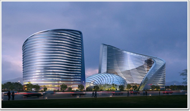 建筑在整體設(shè)計(jì)上,外觀處理以水平線(詞條“水平線”由行業(yè)大百科提供)條為主導(dǎo),立面采用低能耗玻璃配合精心設(shè)計(jì)的建筑幕墻系統(tǒng),極具現(xiàn)代感。整體項(xiàng)目特色在于建筑造型提供的結(jié)構(gòu)幾何要素是東塔與西塔形成的花瓣與資源圃為花蕾中心球形殼體圍合的花朵形體。