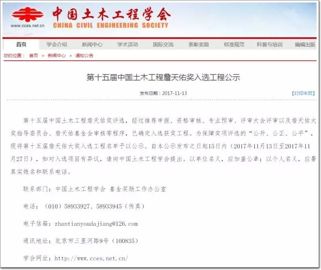 第十五屆中國土木工程詹天佑獎入選工程名單