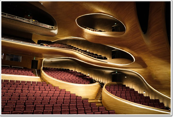 而在大劇院內部大堂頂部巨大的天窗成為焦點,陽光通過天窗上金字塔般的結晶幕墻單元傾瀉而入,灑滿整個大堂。考慮到劇院本身所需要的聲學效果,設計師選擇了質感溫暖的水曲柳木材,做成環繞大劇場室內外的曲面墻體,兼顧美觀與功能。