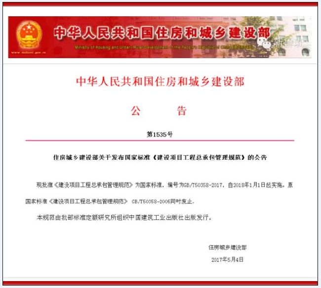近日,住房和城鄉建設部發布第1535號公告,批準《建設項目工程總承包管理規范》為國家標準,編號為GB/T50358-2017,自2018年1月1日起實施。出臺有關的背景、重大內容的調整和補充以及問題解決的方法,工程建設相關各方需要深入了解。